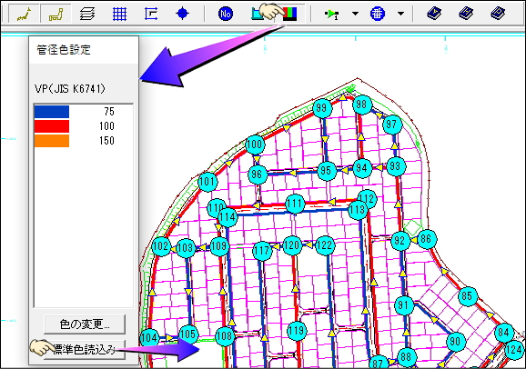 2-2.管径標準色設定でセットしました標準色を採用する場合は"管径毎に色別表示"をONにした状態で[標準色読込み]ボタンをクリックすることでリストに表示されている全管径が登録された標準色に一斉に変更されます。